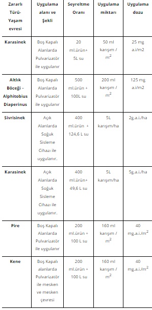 Güçlü etkisiyle ani öldürücülüğü yüksek, son derece ekonomik ve geniş spektrumlu bir insektisittir. Tüm yürüyen ve uçan böcek ve dış paraziteri öldürür. Konsantredir ve son derece ekonomiktir. Pire,Sinek,Kene gibi akla gelen en önemli dış parazitleri anında öldürür.